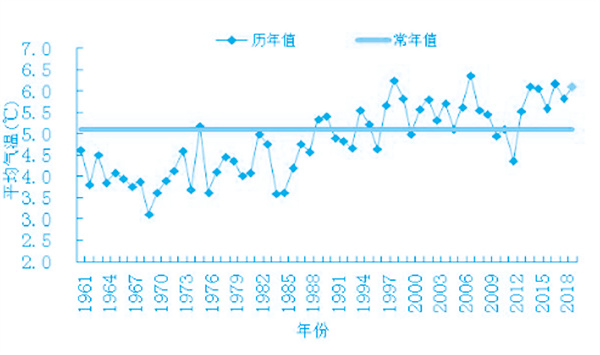 2019年,全區(qū)平均氣溫為6.1℃,比歷史同期偏高1℃,比上年同期高0.3℃,為1961年以來同期第5高。