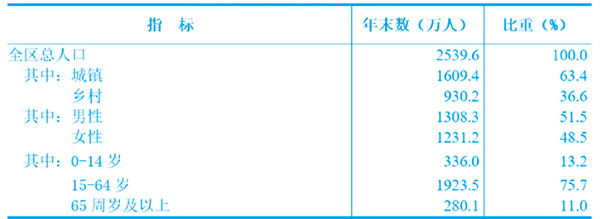 年末,全區(qū)常住人口2539.6萬人,比上年末增加5.6萬人。其中,城鎮(zhèn)人口1609.4萬人,鄉(xiāng)村人口930.2萬人;常住人口城鎮(zhèn)化率63.4%,比上年提高0.7個百分點。男性人口1308.3萬人,女性人口1231.2萬人。全年出生人口20.9萬人,出生率為8.23‰;死亡人口14.4萬人,死亡率為5.66‰;人口自然增長率為2.57‰。