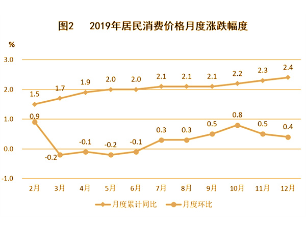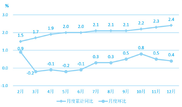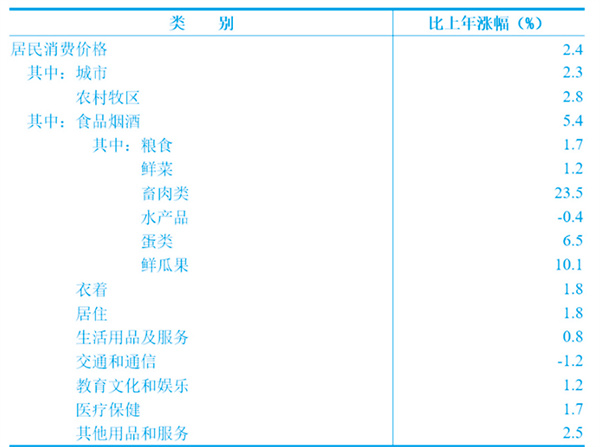 全年居民消費價格比上年上漲2.4%。分城鄉(xiāng)看,城市上漲2.3%,農村牧區(qū)上漲2.8%。分類別看,食品煙酒類價格上漲5.4%,衣著類上漲1.8%,居住類上漲1.8%,生活用品及服務類上漲0.8%,交通和通信類下降1.2%,教育文化和娛樂類上漲1.2%,醫(yī)療保健類上漲1.7%,其他用品和服務類上漲2.5%。從工業(yè)生產者角度看,工業(yè)生產者出廠價格和購進價格分別上漲2.1%和1.1%。固定資產投資價格上漲1.7%,農產品生產者價格上漲5.6%。
