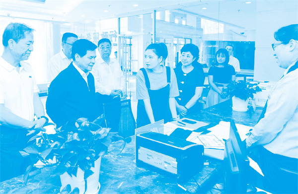 【楊偉東到自治區(qū)市場監(jiān)管局調(diào)研指導(dǎo)工作】 8月5日,自治區(qū)黨委常委、組織部部長、自治區(qū)黨委主題教育領(lǐng)導(dǎo)小組副組長楊偉東,在自治區(qū)黨委組織部副部長周凱、自治區(qū)黨委主題教育第八巡回指導(dǎo)組長金華陪同下,到自治區(qū)市場監(jiān)管局調(diào)研工作。黨組書記陳潔匯報主題教育開展情況,局長白清元、黨組成員、副局長、機關(guān)黨委書記張永強參加有關(guān)活動。在行政服務(wù)大廳,部長楊偉東了解深化“放管服”改革、推進商事制度改革、市場主體準(zhǔn)入便利化、市場主體發(fā)展?fàn)顩r等情況,強調(diào)自治區(qū)市場監(jiān)管局承擔(dān)著服務(wù)經(jīng)濟高質(zhì)量發(fā)展的重要職能,要緊盯人民群眾、企業(yè)的新需求,將服務(wù)做到位。在主題教育辦公室,部長楊偉東深入了解主題教育開展情況、聽取黨建信息平臺學(xué)習(xí)使用介紹、觀看主題教育宣傳視頻,指出自治區(qū)市場監(jiān)管局主題教育氛圍比較濃厚、效果逐步顯現(xiàn),強調(diào)要堅決落實總書記習(xí)近平“四個到位”要求,堅持把學(xué)習(xí)教育貫穿始終,堅持把“改”字貫穿始終,強化組織領(lǐng)導(dǎo),扛起政治責(zé)任。