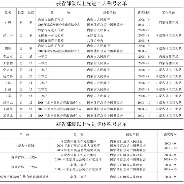 【競(jìng)技體育】年內(nèi),各盟市在自治區(qū)體育局注冊(cè)的青少年運(yùn)動(dòng)員7 500多名,在國(guó)家體育總局注冊(cè)的運(yùn)動(dòng)員1 200多名,是歷史上人數(shù)最多的一年。各項(xiàng)青少年錦標(biāo)賽參賽人數(shù)大幅度增加,柔道600多人、拳擊400多人、摔跤600多人,射箭由以往每年僅有三四十人參加增加到2008年達(dá)到200多人,田徑比賽人數(shù)突破1 200人,是歷史上的最好水平。2008年有自治區(qū)級(jí)競(jìng)技體育后備人才基地31個(gè);有各級(jí)各類(lèi)體校77所,其中省級(jí)1所,市級(jí)12所,旗、縣、區(qū)級(jí)64所,教練員人數(shù)666人,在訓(xùn)人數(shù)達(dá)11 000多人。2008年,自治區(qū)優(yōu)秀運(yùn)動(dòng)員參加包括北京奧運(yùn)會(huì)在內(nèi)的70多項(xiàng)國(guó)際、國(guó)內(nèi)賽事,共獲得30個(gè)第一名、28個(gè)第二名、47個(gè)第三名,113人次進(jìn)入比賽名次,其中,剛成立兩年的女子拳擊獲得亞洲錦標(biāo)賽第二名和世界錦標(biāo)賽第三名;女子乒乓球隊(duì)成功晉級(jí)甲A,是自治區(qū)乒乓球隊(duì)參加俱樂(lè)部比賽以來(lái)取得的最好成績(jī)。