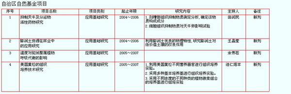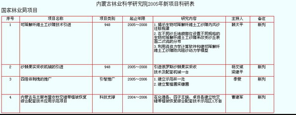 【科研項目】 自治區(qū)林業(yè)科學研究院承擔的科研項目共46項,其中延續(xù)項目33項,新列項目13項(詳見2005年科研項目表)。按項目類別統(tǒng)計科技攻關14項,自然科學基金9項,引智及引進技術11項,“973”專題1項,科技支撐2項,科技推廣3項,成果轉(zhuǎn)化1項,國際科技合作3項,科技能力建設1項,科技扶貧1項。在2005年承擔的13項新項目中,948項目2項,主要有“可降解纖維土工沙障技術引進”、“沙棘果實采收機械的引進”項目;引智推廣項目5項,主要有“四倍體刺槐的推廣”、“亞洲中部水循環(huán)及其對全球變化的影響”、“流動沙丘固定新技術及材料的應用”等;應用基礎研究5項,其中應用研究項目主要有“內(nèi)蒙古固沙源治理區(qū)生態(tài)變化跟蹤評估體系研究”、“抑制天牛及分泌物活性藥物研究”、“膨潤土資源在林業(yè)中的應用研究”等。