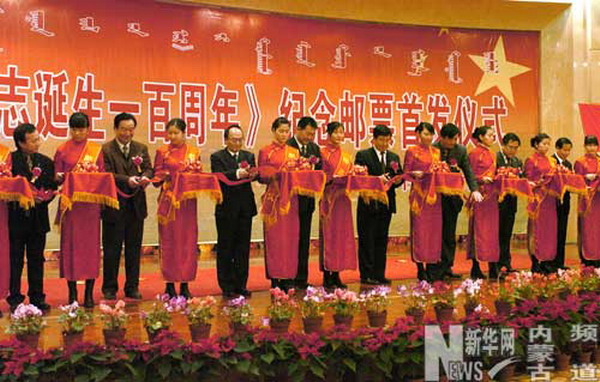 《烏蘭夫同志誕生一百周年》紀念郵票首發(fā):嘉賓為《烏蘭夫同志誕生一百周年》紀念郵票首發(fā)儀式剪彩。12月23日是烏蘭夫同志誕辰100周年。當日下午,由國家郵政總局發(fā)行的《烏蘭夫同志誕生一百周年》紀念郵票的首發(fā)式在內(nèi)蒙古自治區(qū)首府呼和浩特市舉行。