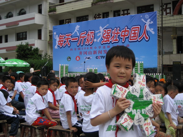 井岡山啟動活動:2006年內(nèi)蒙古蒙牛乳業(yè)集團股份有限公司率先向全國貧困地區(qū)500所中小學捐贈牛奶一年,預計受益小學生在7~10萬人,所捐牛奶總價值達1.1億元.