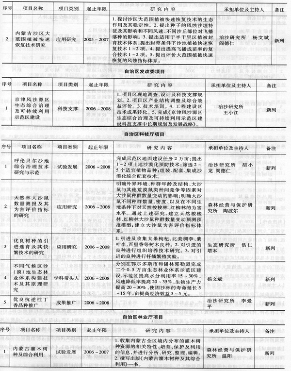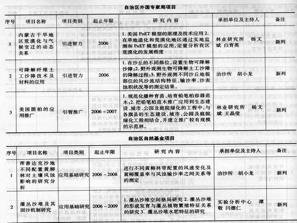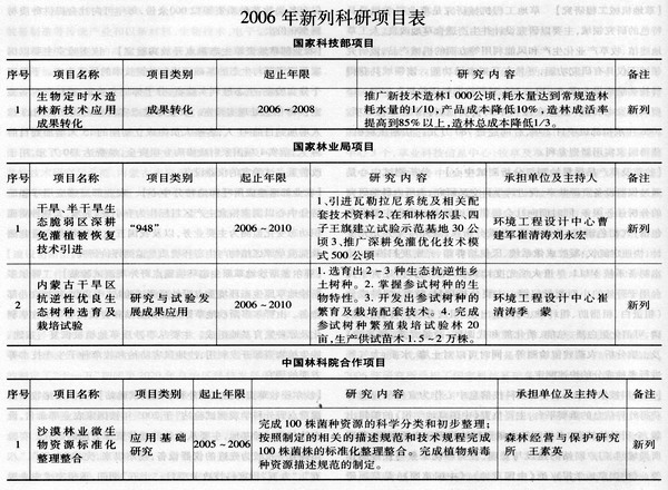 【科研項目】2006年學院承擔項目(從2005年12月1日~2006年11月30日)共計42項,其中延續(xù)項目25項,新列項目17項。按承擔項目來源渠道統(tǒng)計:科技部1項、國家自然科學基金委1項、國家林業(yè)局12項、中國林科院4項、內(nèi)蒙古科技廳7項、內(nèi)蒙古外專局5項、內(nèi)蒙古發(fā)改委2項、內(nèi)蒙古林業(yè)廳2項、內(nèi)蒙古自然科學基金6項、內(nèi)蒙古扶貧辦1項、其他合作項目1項。按承擔項目類別統(tǒng)計:科技攻關(guān)12項、應(yīng)用基礎(chǔ)8項、引智及引進技術(shù)11項、科技支撐3項、科技推廣3項、成果轉(zhuǎn)化1項、國際科技合作1項、科技能力建設(shè)1項、優(yōu)秀學科帶頭人1項、科技扶貧1項。