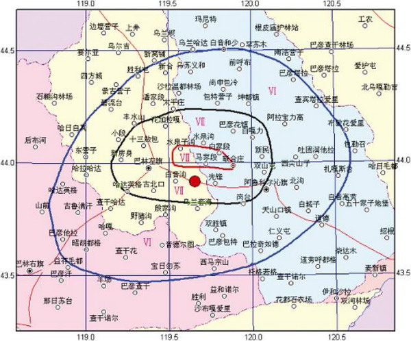 這次地震強烈有感范圍較大,波及內(nèi)蒙古自治區(qū)的赤峰市、通遼市、錫林郭勒盟以及吉林、北京等地區(qū)。宏觀震中位于赤峰市巴林左旗白音溝鄉(xiāng)水泉溝村和阿魯科爾沁旗烏蘭哈達鄉(xiāng)西山灣村,震中烈度為Ⅷ度。