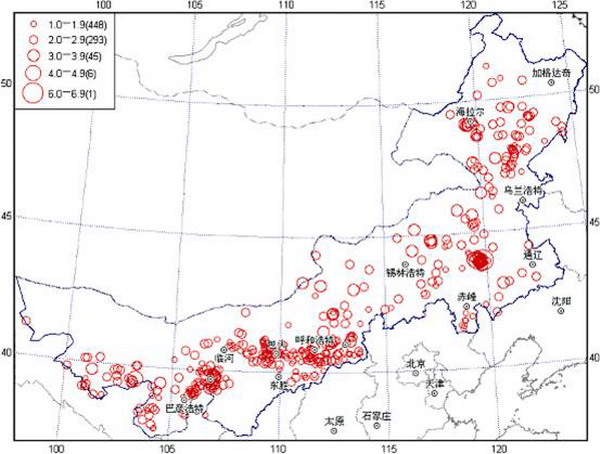 2003年,內(nèi)蒙古自治區(qū)發(fā)生ML≥1.0級地震793次,其中ML1.0~1.9級地震448次;2.0~2.9級地震293次;3.0~3.9級地震45次;4.0~4.9級地震6次;MS5.0~5.9級地震1次;最大地震是2003年8月16日赤峰市巴林左旗、阿魯科爾沁旗間MS5.9級地震。