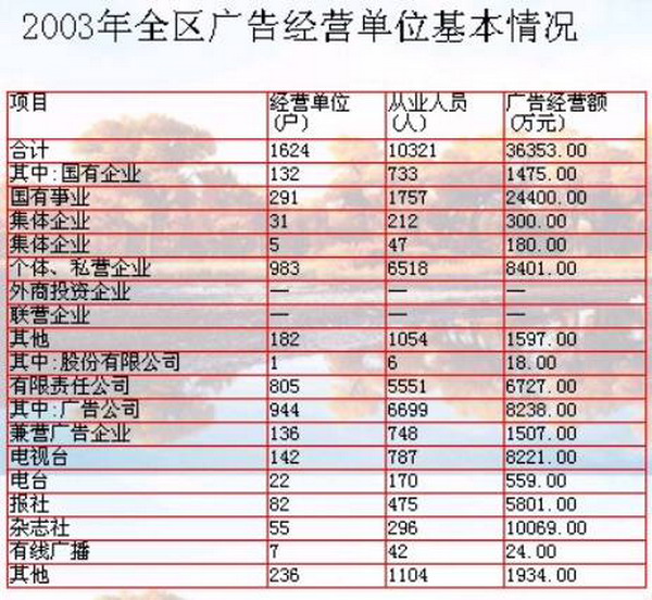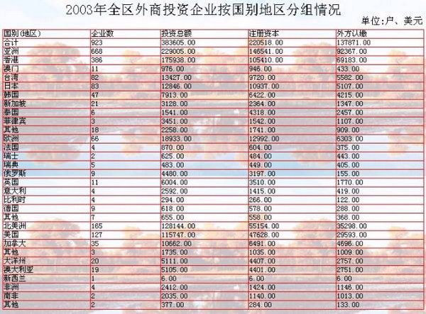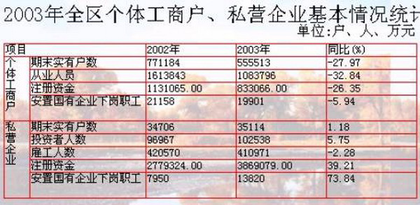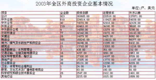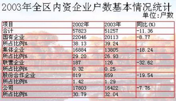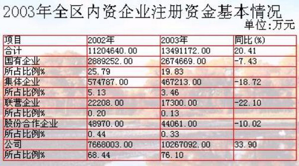 至2003年底,全區(qū)共登記注冊內(nèi)資企業(yè)51 257戶,比上年同期下降11%,注冊資本1 349億元,比上年同期增長20%;私營企業(yè)35 114戶,注冊資本387億元,分別比上年增長1%和39%;個體工商戶555 513戶,注冊資本83億元,分別比上年同期下降28%和26%;外商投資企業(yè)923戶,投資總額38億美元,注冊資本22億美元,分別比上年同期增長15%、58%和30%。