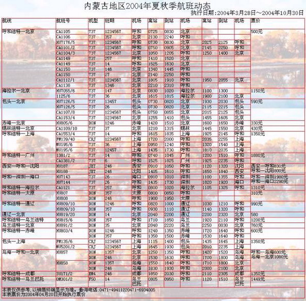 【航線里程】2003年,民航內(nèi)蒙區(qū)局共經(jīng)營航線29條。其中國內(nèi)航線26條:呼和浩特—錫林浩特、呼和浩特—赤峰、呼和浩特—通遼、呼和浩特—烏蘭浩特、呼和浩特—海拉爾、呼和浩特—北京、呼和浩特—太原、呼和浩特—青島(旅游包機)、呼和浩特—濟南(旅游包機)、呼和浩特—合肥(旅游包機)、呼和浩特—上海、呼和浩特—廣州、呼和浩特—深圳—海口、呼和浩特—西安—成都、呼和浩特—西安、西安—呼和浩特—沈陽、包頭—北京、包頭—濟南(旅游包機)、包頭—上海、海拉爾—北京、海拉爾—大連(旅游包機)、錫林浩特—北京、赤峰—北京、通遼—北京、烏蘭浩特—北京、北京—呼和浩特—烏海。國際航線3條:呼和浩特—烏蘭巴托、呼和浩特—曼谷(旅游包機)、呼和浩特—莫斯科(貨包機)。通航城市23個:呼和浩特、包頭、錫林浩特、赤峰、通遼、烏蘭浩特、海拉爾、烏海、北京、上海、廣州、深圳、海口、成都、西安、太原、沈陽、大連、青島、濟南、合肥,烏蘭巴托、曼谷、莫斯科。通航里程 25 520公里。運營公司 9家:中國國際航空公司(CA)、海南航空公司(HU)、上海航空公司(FM)、東方航空公司(MU)、四川航空公司(3U)、山東航空公司(SC);蒙古國航空公司(OM)、泰國航空公司(TG)和俄羅斯公司(4J)。運營機型 B737—300、DON(多尼爾)328、A(空中客車)320、CRJ、EMB145、AN4、沖八、福克50、IL76等。