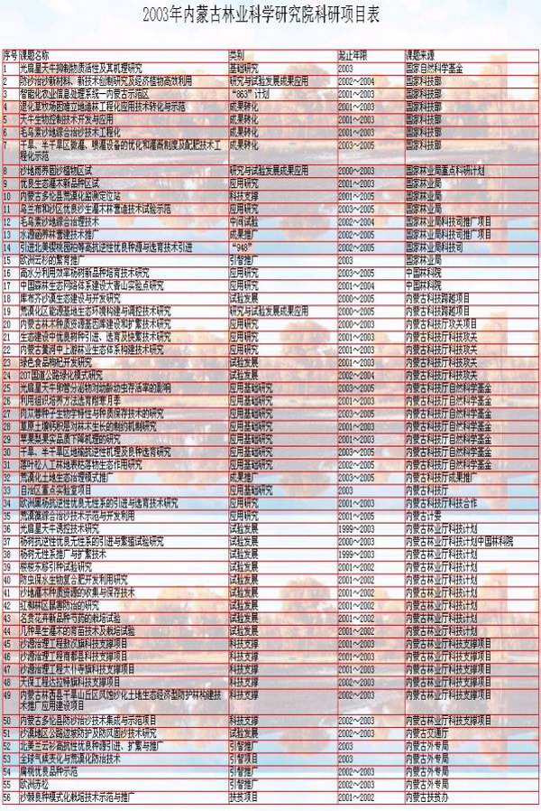 【科技支撐】內(nèi)蒙古林科院承擔的7項科技支撐項目,按照項目實施方案規(guī)定的計劃任務(wù)順利進行。其中2001年立項的敖漢旗、太仆寺旗、商都縣三個旗縣的京津風沙源治理工程科技支撐項目和達拉特旗天然林保護工程的科技支撐項目,按照上級批復(fù)的實施方案,全面完成任務(wù),建設(shè)成效示范效果總體良好,2004年將如期進行項目驗收。