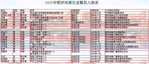 【國(guó)防動(dòng)員建設(shè)和雙擁工作】是年,組織召開旗委第十六次議軍會(huì)議,落實(shí)國(guó)防動(dòng)員委員會(huì)例會(huì)制度,建立健全人民武裝部機(jī)構(gòu)、配齊加強(qiáng)基層武裝干部。中共額濟(jì)納旗委書記兼人民武裝部第一書記勛被北京軍區(qū)表彰為華北地區(qū)“忠誠(chéng)黨的武裝事業(yè)新聞人物”。加大軍地雙方互辦實(shí)事的力度,二十基地官兵捐資興建了額濟(jì)納旗中學(xué)“八一”科技大樓,并在東風(fēng)航天城劃地50公頃用于建設(shè)額濟(jì)納旗辦事處。為保證神舟五號(hào)的順利發(fā)射,額濟(jì)納旗積極配合基地開展清查清理工作,無(wú)條件搬遷試驗(yàn)場(chǎng)區(qū)周圍的農(nóng)牧民。額濟(jì)納旗再次榮獲“全國(guó)雙擁模范旗”稱號(hào)。