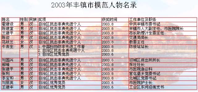 【衛(wèi)生】是年豐鎮(zhèn)市有各類醫(yī)療機(jī)構(gòu)181所,其中市級(jí)8所,鄉(xiāng)級(jí)衛(wèi)生院20所,村級(jí)衛(wèi)生室124個(gè),個(gè)體診所29所;各類衛(wèi)生技術(shù)人員679人。豐鎮(zhèn)市作為全盟重點(diǎn)疫區(qū),承擔(dān)防非重任,取得“無死亡、無感染病例無死亡,醫(yī)護(hù)人員無感染“疫情無擴(kuò)散”的好成績(jī),市醫(yī)院黨總支被中組部授予“全國(guó)防治非典先進(jìn)基層黨組織”的稱號(hào)。