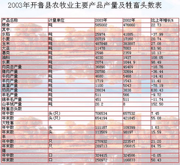 【概況】開魯縣位于內(nèi)蒙古中東部,隸屬通遼市。總區(qū)域面積4 488平方公里,總?cè)丝?9萬,共有漢、蒙、滿、回等11個民族,轄18個蘇木鄉(xiāng)鎮(zhèn)及保安農(nóng)場、遼河農(nóng)場。國民經(jīng)濟(jì)快速增長。2003年,國內(nèi)生產(chǎn)總值實現(xiàn)31.0億元,按可比價格計算,比上年增長18.6%,加快2.5個百分點。其中第一產(chǎn)業(yè)增加值實現(xiàn)15.5億元,比上年增長13.0%,加快1.2個百分點;第二產(chǎn)業(yè)增加值實現(xiàn)6.9億元,比上年增長28.2%,加快7.2個百分點;第三產(chǎn)業(yè)增加值實現(xiàn)8.6億元,比上年增長22.3%,加快1.1個百分點。全縣財政收入完成8 200萬元,比上年增長13.89%,其中地方財政收入完成6 528萬元,比上年增長18.28%。居民消費(fèi)價格總指數(shù)上漲1.8%;商品零售價格指數(shù)上漲1.2%;農(nóng)業(yè)生產(chǎn)資料價格指數(shù)下降2.0%。年末全縣從業(yè)人員19.64萬人,比上年增加0.42萬人,增長2.16%;全年有1 622名下崗失業(yè)人員實現(xiàn)再就業(yè)。年末,城鎮(zhèn)登記失業(yè)率為3.9%。