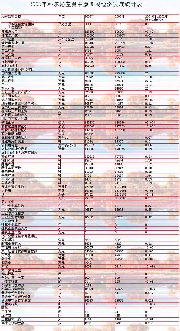 2003年,全旗總?cè)丝?26 998人,其中蒙古族人口374 705人,占全旗總?cè)丝跀?shù)的71%;漢族人口145 528人,占全旗總?cè)丝跀?shù)的27.6%。全旗財(cái)政收入完成9 263萬元,為預(yù)算的100.14%,比上年增收1 393萬元,增長(zhǎng)17.7%。其中地方財(cái)政收入完成8 202萬元,比上年增長(zhǎng)17.6%。農(nóng)牧民和城鎮(zhèn)居民均可支配收入完成2 286元和5 095元,分別增長(zhǎng)19.3%和23.5%。全年全旗國(guó)民生產(chǎn)總值達(dá)225 408萬元,比上年增長(zhǎng)21.1%。全旗轄有11個(gè)鎮(zhèn)、11個(gè)蘇木、4個(gè)鄉(xiāng)、4個(gè)國(guó)有農(nóng)牧林場(chǎng),共計(jì)30個(gè)行政區(qū),下轄519個(gè)嘎查。