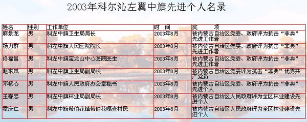 【先進(jìn)集體】科左中旗人民政府辦公室,于2003年8月被內(nèi)蒙古自治區(qū)黨委、政府評(píng)為全區(qū)抗擊“非典”先進(jìn)集體。