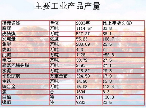 【工業(yè)】2003年,烏海市以提高工業(yè)化、城市化水平為主攻方向,以發(fā)展高載能工業(yè)為突破口,以重點項目建設(shè)為龍頭,以能源、化工、建材、特色冶金等支柱產(chǎn)業(yè)的改造、提升和擴張為著力點,發(fā)揮比較優(yōu)勢,工業(yè)經(jīng)濟持續(xù)快速增長,經(jīng)濟效益進一步提高,呈現(xiàn)6個特點: