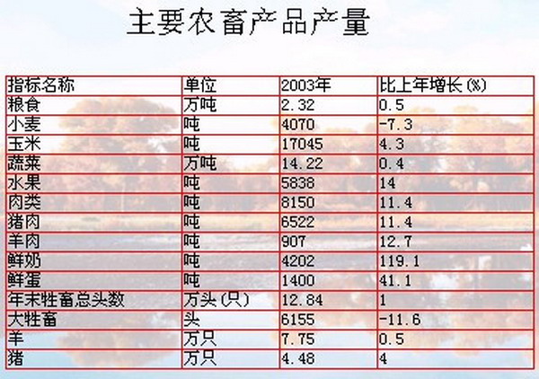2003年,全市完成農(nóng)業(yè)增加值1.38億元,比上年增長6.6%;農(nóng)牧民人均純收入達3 080元,比上年增長15%。年末,農(nóng)牧業(yè)機械總動力15.46萬千瓦,同比增長13.4%;農(nóng)業(yè)生產(chǎn)用電2 974萬千瓦時,同比降低2.3%;農(nóng)用化肥施用量5 868噸(折純),比上年增長5.9%。