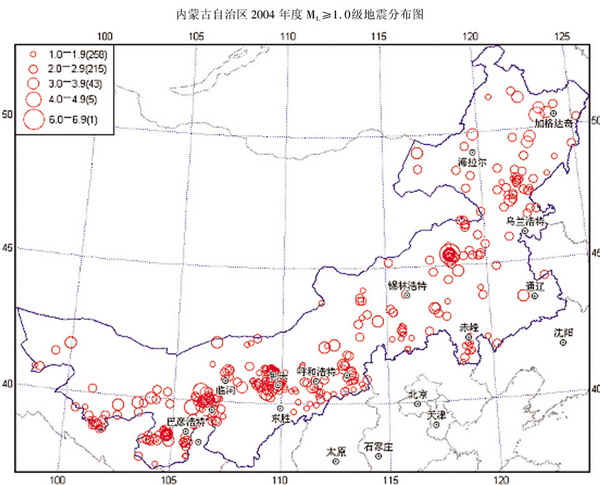 【地震活動】2004年,內(nèi)蒙古自治區(qū)發(fā)生ML≥1.0級地震522次,其中ML1.0~1.9級地震258次;2.0~2.9級地震215次;3.0~3.9級地震43次;4.0~4.9級地震5次;MS5.0~5.9級地震1次;最大地震是2004年3月24日錫林郭勒盟東烏珠穆沁旗MS5.9級地震。