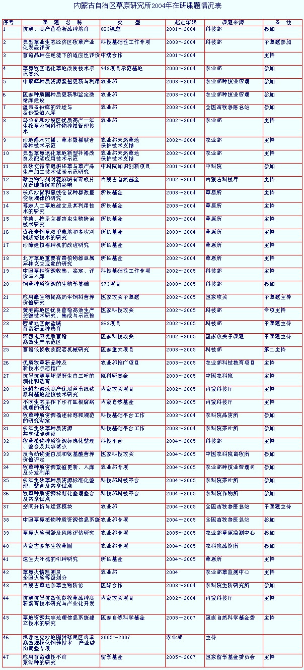 【科研項目】是年,新獲準(zhǔn)立項項目15項。2004年底草原所在研科研項目達(dá)到47項(詳見內(nèi)蒙古自治區(qū)草原研究所2004年在研課題情況表);獲得新型實用專利1項;出版科技著作3部;發(fā)表科技論文53篇。