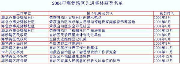 【科技】2004年,海勃灣區(qū)科技局被評為全國科技示范先進區(qū),科技三項費用投入為119萬元,占本級年度財政一般性支出(10218萬元)比例為1.1%。海勃灣區(qū)共安排科技計劃項目12項,其中工業(yè)項目3項,農(nóng)業(yè)項目7項,軟科學(xué)研究項目1項、國家重點項目1項。工業(yè)方面,扶持瓏瑛玻璃制品公司的玻璃制品烤花項目;烏海市金廈化學(xué)制品有限公司的新開發(fā)3000噸甲酸鈉項目等。重點扶持了“人事勞動和社會保障信息自動化管理”和“人員編制信息自動化管理”項目,實現(xiàn)人才資源的網(wǎng)絡(luò)自動化管理。