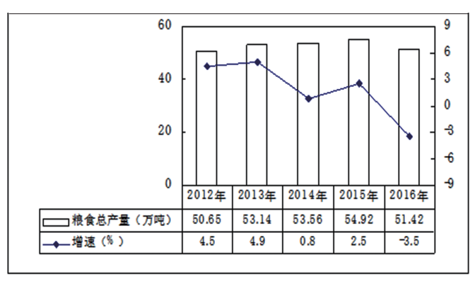 圖2 2012—2016年杭后糧食總產(chǎn)量及增長速度