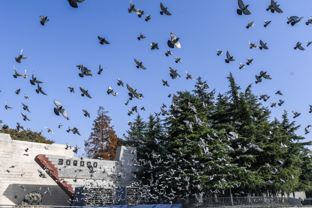 2022年12月13日,南京大屠殺死難者國(guó)家公祭儀式現(xiàn)場(chǎng)放飛和平鴿。新華社記者 李博 攝