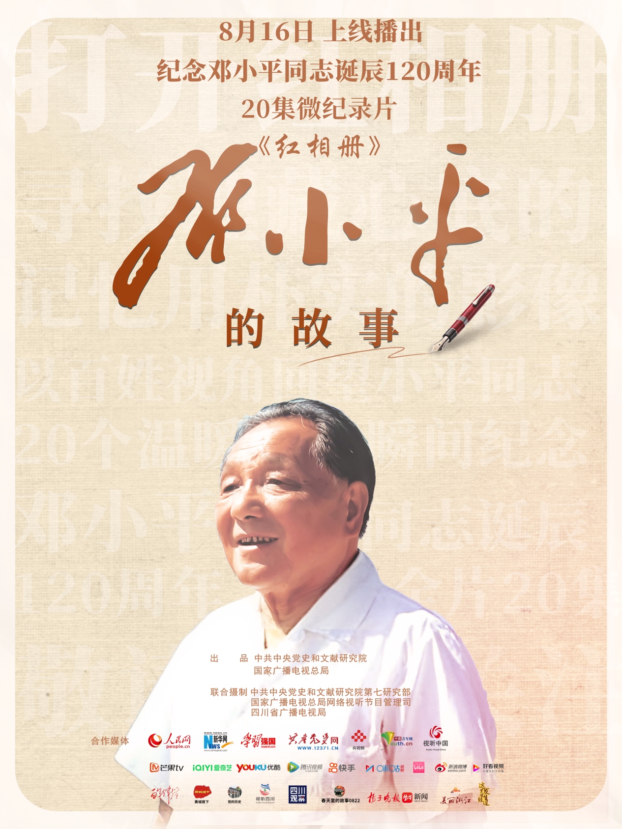 為紀(jì)念鄧小平同志誕辰120周年,由中共中央黨史和文獻研究院、國家廣播電視總局聯(lián)合出品的20集微紀(jì)錄片《紅相冊·鄧小平的故事》將于8月16日上線播出。