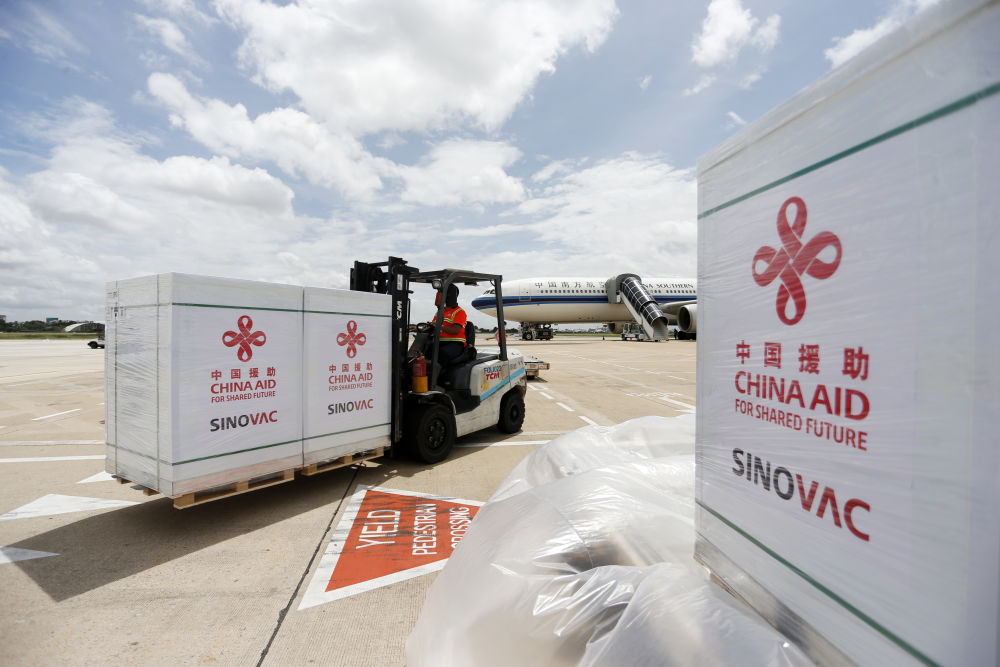 工作人員在柬埔寨金邊國(guó)際機(jī)場(chǎng)運(yùn)輸中國(guó)政府援助柬埔寨的科興新冠疫苗(2021年10月14日攝)。新華社發(fā)(批隆攝)