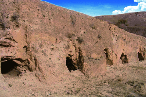 井兒溝后窯子村,東、西、北三面環(huán)山,北面大山上有自然巖洞,山上可望見得勝溝。東、西兩側(cè)有窯洞遺址,但大多殘損,唯東壁的一個大的窯洞較為完整,窯洞深3.4米,高2.6米,寬2.8米,頂部呈半圓形,一門一窗,門前有2平方米的臺地與溝下形成臺階狀地形。