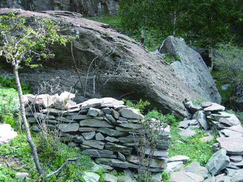 1939年,大青山游擊根據(jù)地遭受日軍掃蕩,為了便于機動靈活、隱蔽地開展抗日斗爭,八路軍大青山騎兵支隊在大青山深處的畢克齊鎮(zhèn)西梁村西南前石門建立了營地。營地前的懸崖底部,人煙稀少,交通不便,全是羊腸小道,并與營地之間距離較遠,便于防避敵人的襲擊。綏察行政公署、綏西專員公署的人員也常在這里研究工作。幾十年過去了,現(xiàn)仍保留有5間石壘墻基。