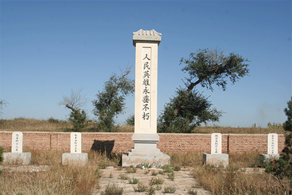 陵園為正方形,長寬各40米,總面積1600平方米。人民英雄紀念碑坐落在陵園中央,正面向陽,碑高7米,磚石結(jié)構(gòu)。紀念碑由碑座、碑身、碑頂三部分組成。碑座為須彌形,0.8米,正面正中心刻著“人民英雄永垂不朽”。碑頂是傳統(tǒng)的廡殿頂式。紀念碑的兩面各有兩位烈士的墓碑,墓碑高1.5米,寬0.6米。這4位烈士分別是(從東向西)包喜、包來寶、圖古蘇、金寶力道。
