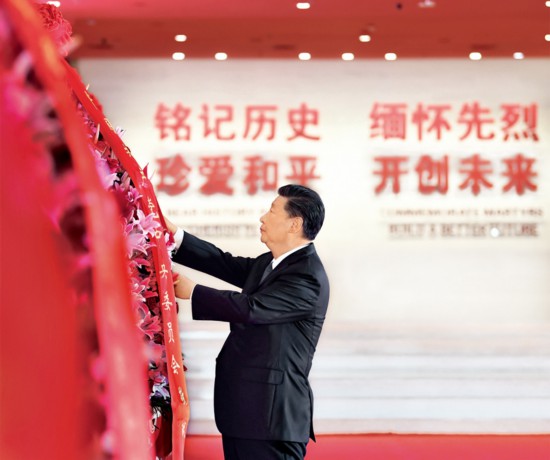 2020年9月3日上午,習(xí)近平、李克強(qiáng)、栗戰(zhàn)書、汪洋、王滬寧、趙樂際、韓正、王岐山等黨和國家領(lǐng)導(dǎo)人來到中國人民抗日戰(zhàn)爭(zhēng)紀(jì)念館,出席紀(jì)念中國人民抗日戰(zhàn)爭(zhēng)暨世界反法西斯戰(zhàn)爭(zhēng)勝利75周年向抗戰(zhàn)烈士敬獻(xiàn)花籃儀式。這是習(xí)近平整理花籃上的緞帶。 新華社記者 謝環(huán)馳/攝