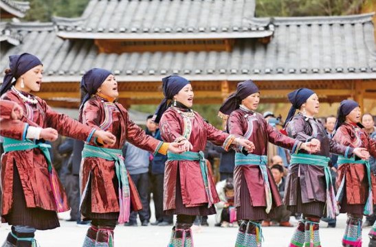 2021年3月21日,廣西柳州三江侗族自治縣八江鎮(zhèn)布代村舉辦傳統(tǒng)春社節(jié),當(dāng)?shù)厝罕娚碇褡迨⒀b,縱情傳唱百年黨史,激情歡歌家鄉(xiāng)巨變,動(dòng)情喜頌黨的恩情。 人民視覺(jué) 龔普康/攝