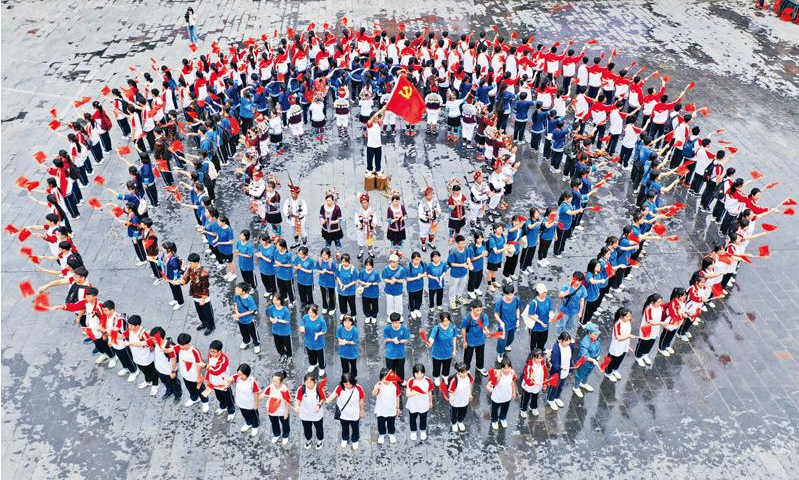 廣西柳州三江侗族自治縣采用群眾喜聞樂(lè)見(jiàn)的方式方法,把紅色資源作為生動(dòng)教材,推動(dòng)黨史學(xué)習(xí)教育深入群眾、深入基層、深入人心。圖為2021年5月17日,當(dāng)?shù)厝罕娫诤铣稕](méi)有共產(chǎn)黨就沒(méi)有新中國(guó)》。 人民視覺(jué) 龔普康/攝