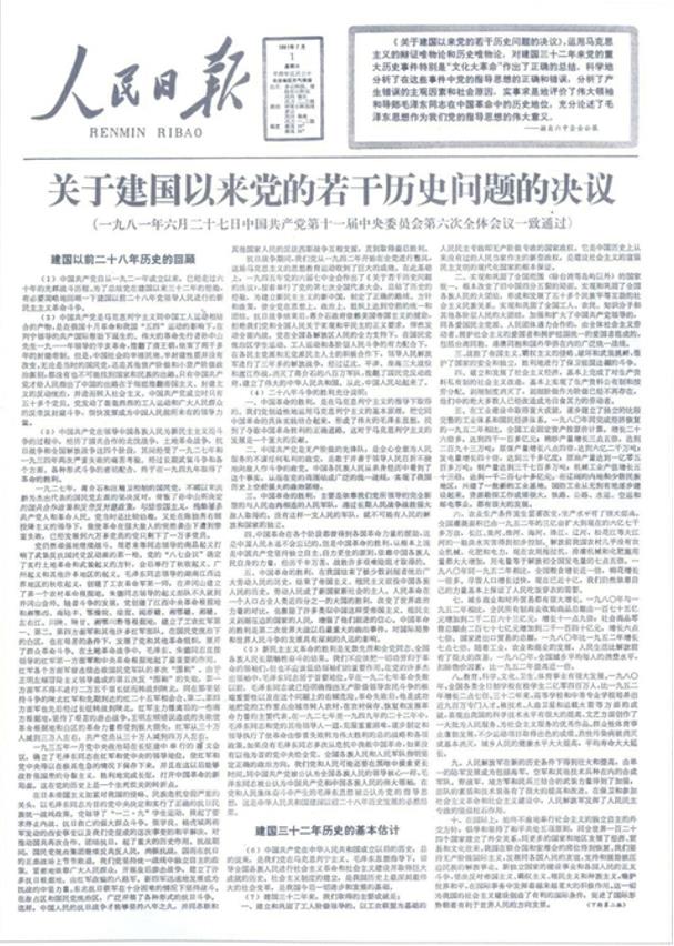 人民日?qǐng)?bào)刊登的《關(guān)于中華人民共和國(guó)成立以來(lái)黨的若干歷史問(wèn)題的決議》