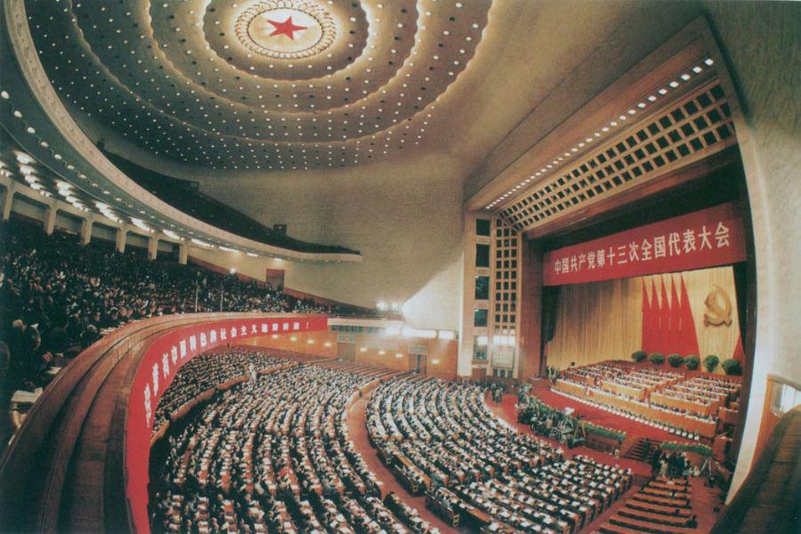 黨的十三大系統(tǒng)論述了社會主義初級階段理論和黨的基本路線,確定分三步走實現(xiàn)現(xiàn)代化的發(fā)展戰(zhàn)略。圖為黨的十三大會場。