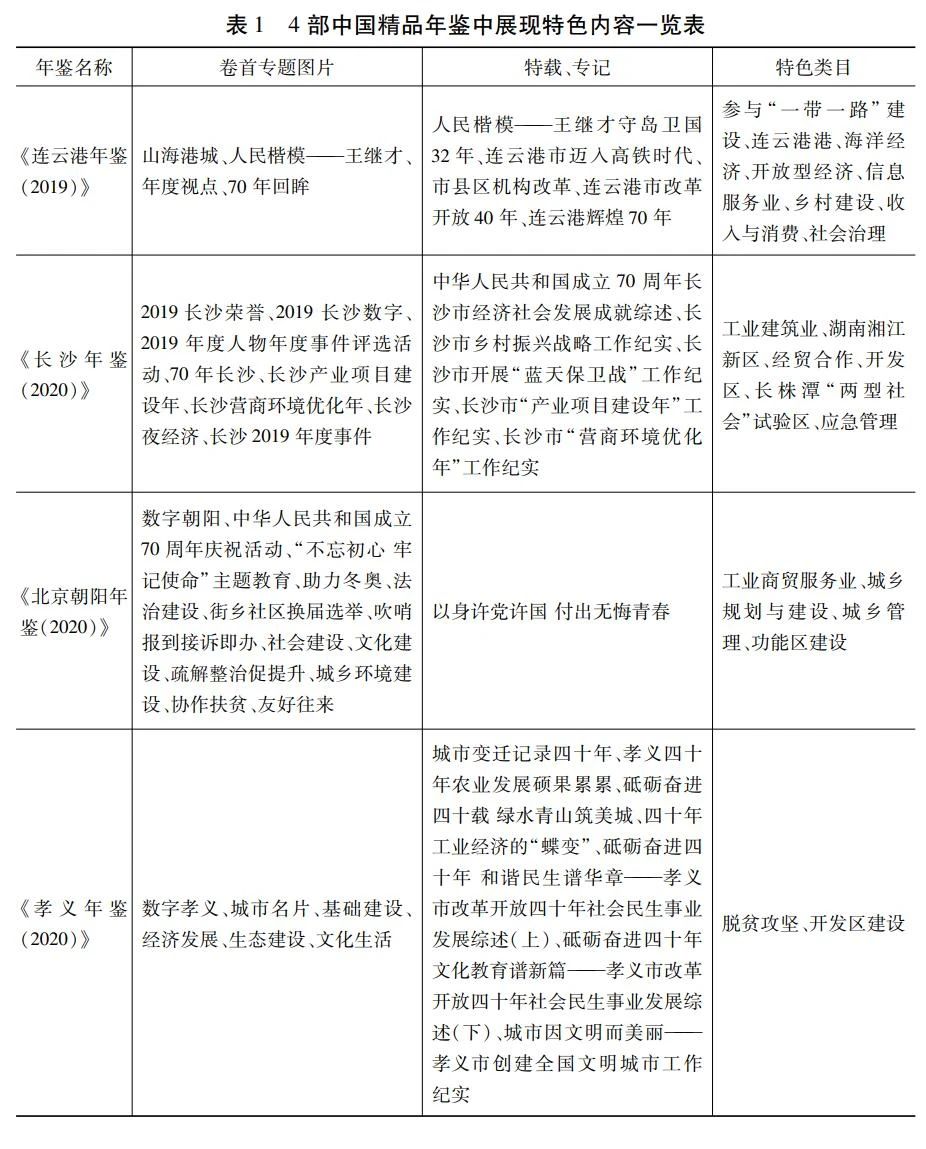 4部中國精品年鑒均高度重視時代特征、區(qū)域特色、年度特點(diǎn)的體現(xiàn),其中尤其突出的是充分運(yùn)用年鑒名稱、卷首專題圖片、特載、專記、特色類目多種體裁,并且善于在不同的體裁中展現(xiàn)不盡相同的特色內(nèi)容(見表1),為各地年鑒編纂提供了啟示和經(jīng)驗(yàn)。