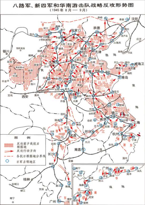 戰(zhàn)略反攻階段的決勝力量。從1943年起,敵后戰(zhàn)場逐步扭轉(zhuǎn)困難局面,進入恢復(fù)再發(fā)展階段。以晉冀魯豫地區(qū)八路軍發(fā)動的衛(wèi)(河)南、林(縣)南戰(zhàn)役為起點,開始集中較大兵力對日偽軍開展攻勢作戰(zhàn)。1944年,中國共產(chǎn)黨領(lǐng)導(dǎo)的敵后軍民在華北、華中、華南地區(qū),對日偽軍普遍發(fā)起局部反攻,繼續(xù)擴大抗日民主根據(jù)地。到1945年春,中國共產(chǎn)黨領(lǐng)導(dǎo)的抗日民主根據(jù)地,總面積約95萬平方公里,人口近1億,人民軍隊發(fā)展到91萬余人,民兵220萬人。各抗日民主根據(jù)地通過各項建設(shè),不僅成為游擊戰(zhàn)爭的堅強陣地和全國抗戰(zhàn)的重要堡壘,而且成為全面反攻、爭取抗戰(zhàn)最后勝利的前沿陣地。1945年8月,在世界反法西斯戰(zhàn)爭勝利發(fā)展的形勢下,敵后戰(zhàn)場開始全面反攻。由于日軍占領(lǐng)的大部分城鎮(zhèn)、交通要道和沿海地區(qū)已處在解放區(qū)包圍之中,中國共產(chǎn)黨領(lǐng)導(dǎo)的抗日軍民實際上承擔(dān)起對日軍全面反攻的主要任務(wù)。至年底,共殲滅日偽軍近40萬人,收復(fù)縣以上城市250余座,收復(fù)華北、華中和華南大片國土,并協(xié)同蘇軍解放東北全境,取得了全面反攻和殲滅拒絕投降之日偽軍的重大勝利。事實證明,敵后戰(zhàn)場的堅持和發(fā)展,對抗日戰(zhàn)爭的發(fā)展進程和最后結(jié)局具有決定性意義。