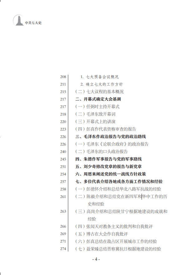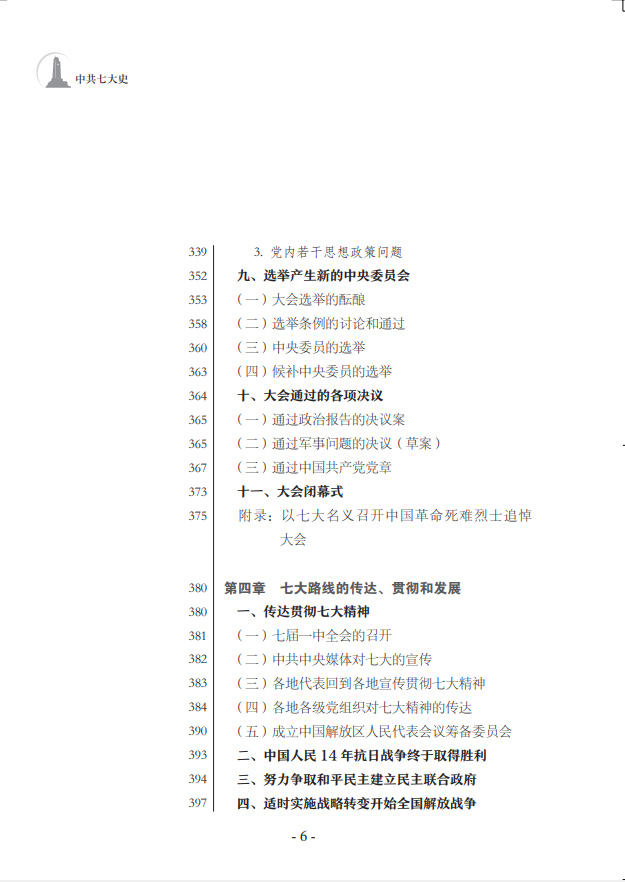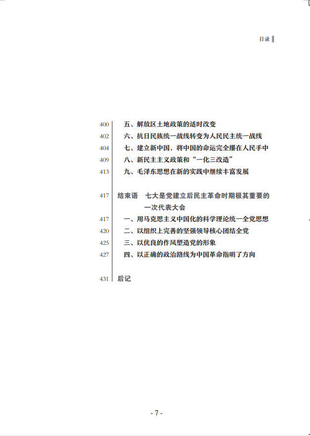 中共七大為新中國(guó)的誕生奠定了基礎(chǔ)。鄧小平稱贊中共七大是“建黨以后民主革命時(shí)期我們黨最重要的一次代表大會(huì)”。《中共七大史》采用最新公布的檔案,廣泛收集文獻(xiàn)資料,全面、完整地反映了中共七大籌備召開的全貌,著重說明中共七大的歷史貢獻(xiàn),特別是第一次將毛澤東思想確立為黨的指導(dǎo)思想并寫進(jìn)黨章所產(chǎn)生的重大影響,簡(jiǎn)要介紹了對(duì)中共七大路線、方針、政策的積極貫徹執(zhí)行情況。
