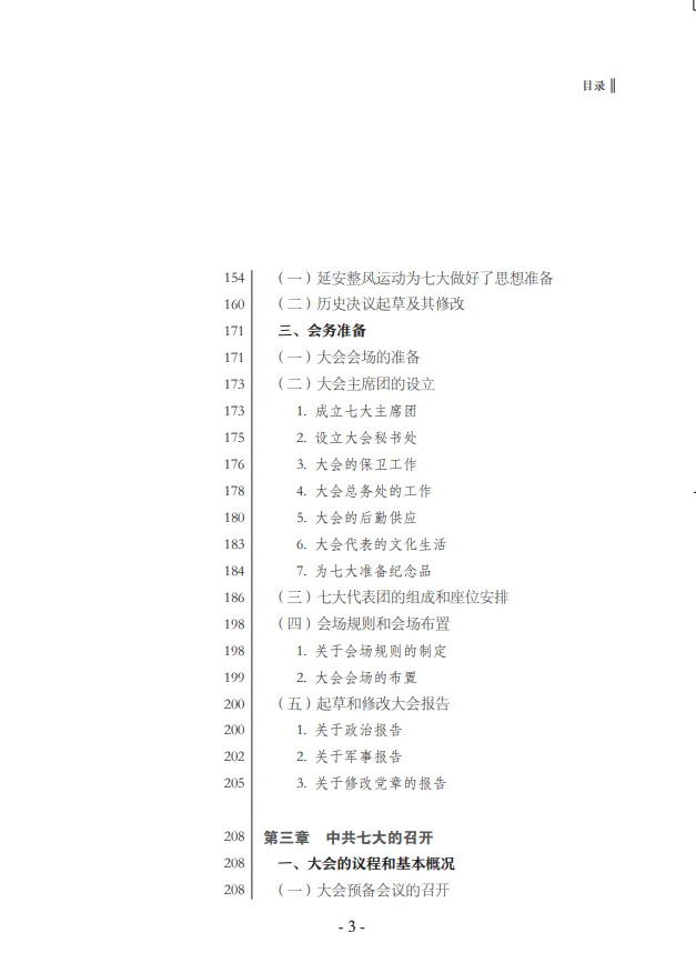 歷史是一個(gè)探索的過程。本書鮮明特點(diǎn)是善于調(diào)查研究、關(guān)注歷史細(xì)節(jié)。作者曾先后采訪了200多位健在的七大代表,他們的回憶極大地增加了該書的可讀性。在“七大代表的集中和審查”部分,書中寫道,分散在全國(guó)各抗日根據(jù)地的七大代表要沖破敵人的重重封鎖,才能到達(dá)會(huì)議召開地延安。比如,冀南的七大代表從1939年9月8日開始出發(fā)。“出發(fā)這天,每個(gè)人配給3天的口糧,6匹大馬滿馱著西去的衣被、零用品,各個(gè)人穿著軍衣,挎著飯包,威風(fēng)凜凜……由于戰(zhàn)爭(zhēng)環(huán)境,要盡可能地夜間行軍,白天休息。”書中,類似的細(xì)節(jié)還原比比皆是,讀來鮮活生動(dòng)。