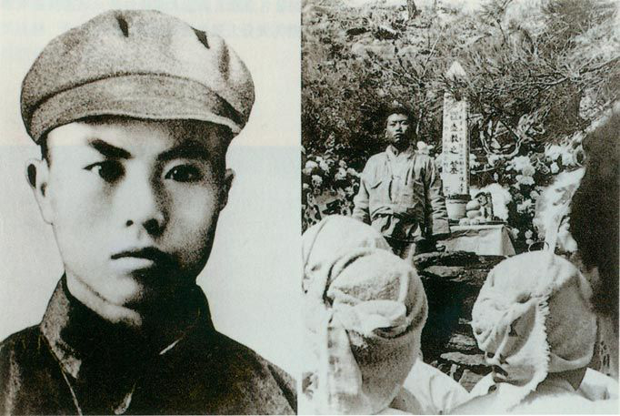 1952年1月2日,志愿軍戰(zhàn)士羅盛教在平安南道成川郡石田里,為搶救跌入冰窟的朝鮮少年而犧牲。被授予“中國人民志愿軍一級模范”稱號。左圖為羅盛教,右圖為被救少年崔瑩在羅盛教墓前。