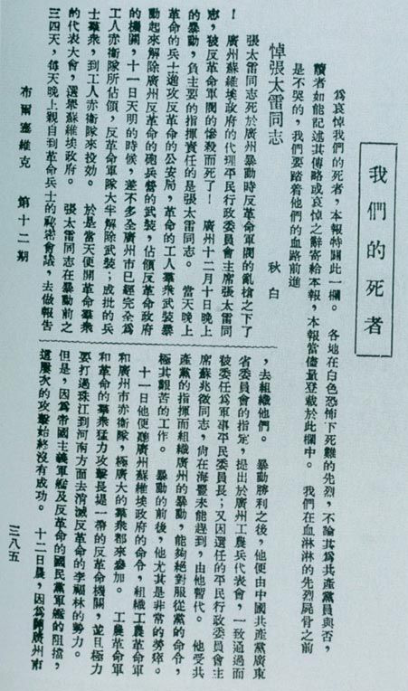 廣州起義失敗后,1928年1月2日,瞿秋白撰《悼張?zhí)淄尽?1月9日在《布爾塞維克》第12期發(fā)表。