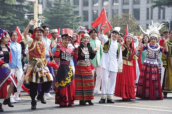 2019年10月1日,慶祝中華人民共和國成立70周年大會在北京天安門廣場隆重舉行。圖為群眾游行中的民族團結(jié)方陣。新華社記者 范培珅攝